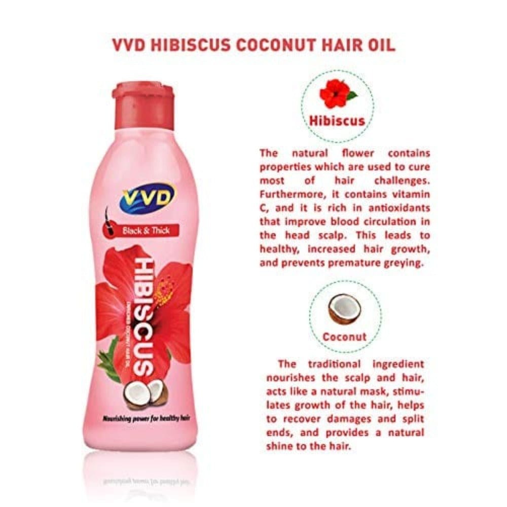Hibiscus is known to have great healing traits and it is widely valued for its extraordinary benefits to hair. The flower contains vitamins and anti-oxidants that improve scalp, hair health, increases hair growth and prevents premature greying, by going deep into the root of your hair and moisturizing them. Get natural dark black and beautiful hair with VVD Hibiscus Enriched Coconut Oil.,
