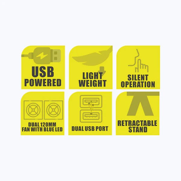 ZEB-NC3300 is a laptop cooling pad with dual USB ports and dual 120mm fans with blue LED along a retractable stand. The fans are silent and the build is designed for optimized airflow.