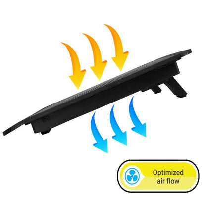 ZEB-NC1200 is a USB-powered laptop cooling pad that comes with a 125mm silent fan with blue LED, passes through USB, and has a retractable stand. The build is designed for optimized airflow.